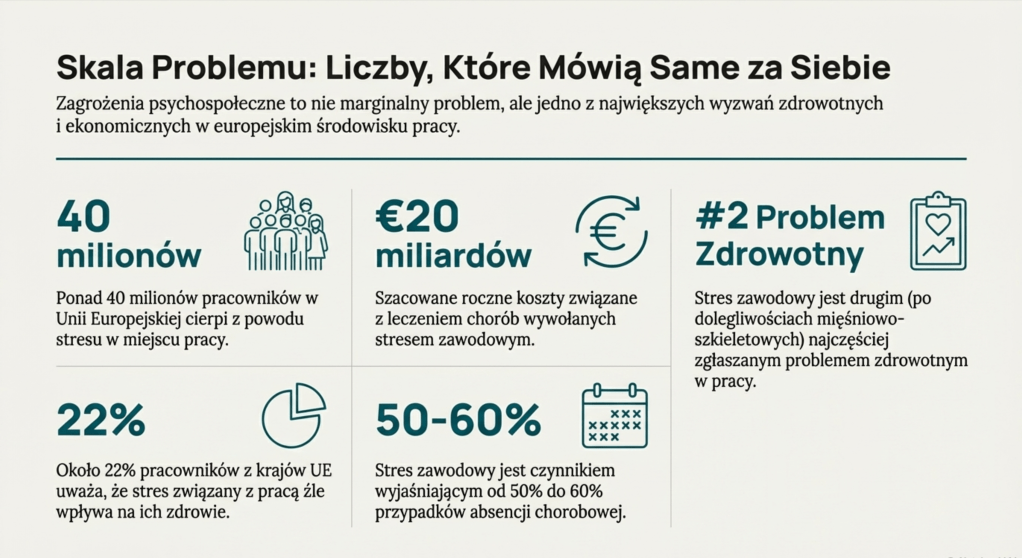 - Stres i wypalenie zawodowe: W UE ponad 40 mln pracowników cierpi z powodu stresu zawodowego, co jest drugą najczęstszą przyczyną problemów zdrowotnych w pracy.